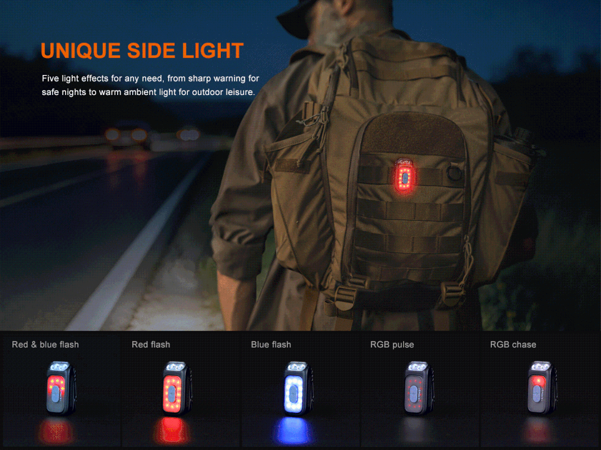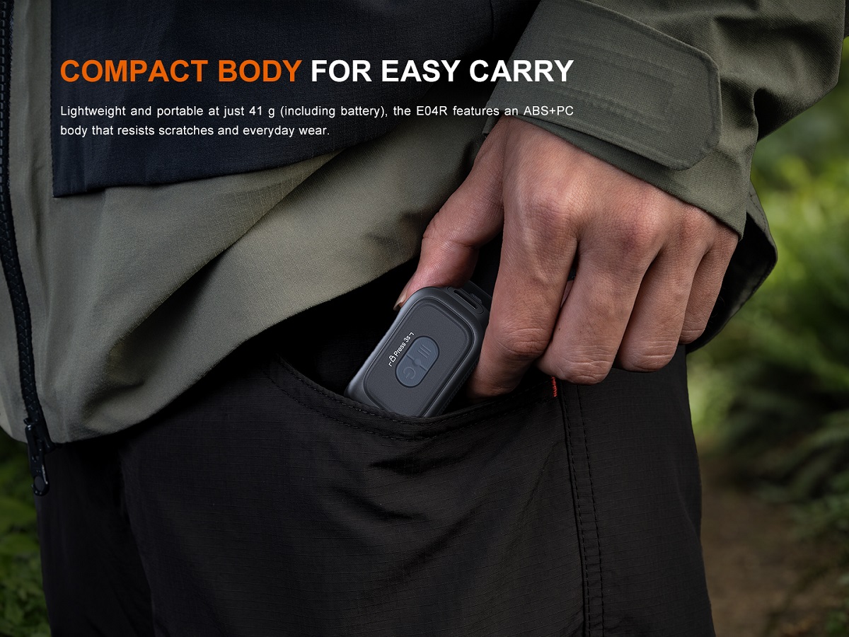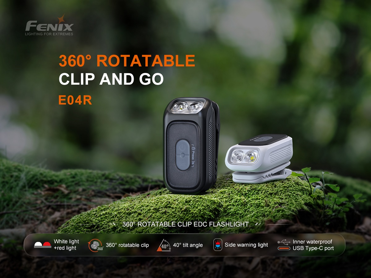 The Fenix E04R is a meticulously crafted compact EDC flashlight where precision meets portability. It masterfully combines a practical white light, a night-vision-preserving red light, and a versatile multi-function side light. Its unique side light features emergency red/blue flashing, an atmospheric RGB breathing mode, and a dynamic RGB chase effect, delivering unmatched visual signaling for critical situations while adding ambiance to outdoor leisure. Power is supplied by a built-in 400mAh battery, recharged swiftly via a USB Type-C port on the flashlight. The innovative 360° rotatable clip offers secure, flexible attachment to pockets, caps, backpacks, shoulder straps, MOLLE, and beyond, adapting effortlessly to any scenario. More than a flashlight, the E04R elevates the daily carry and makes an especially thoughtful gift. It’s the perfect choice for those who value both preparedness and presentation.
