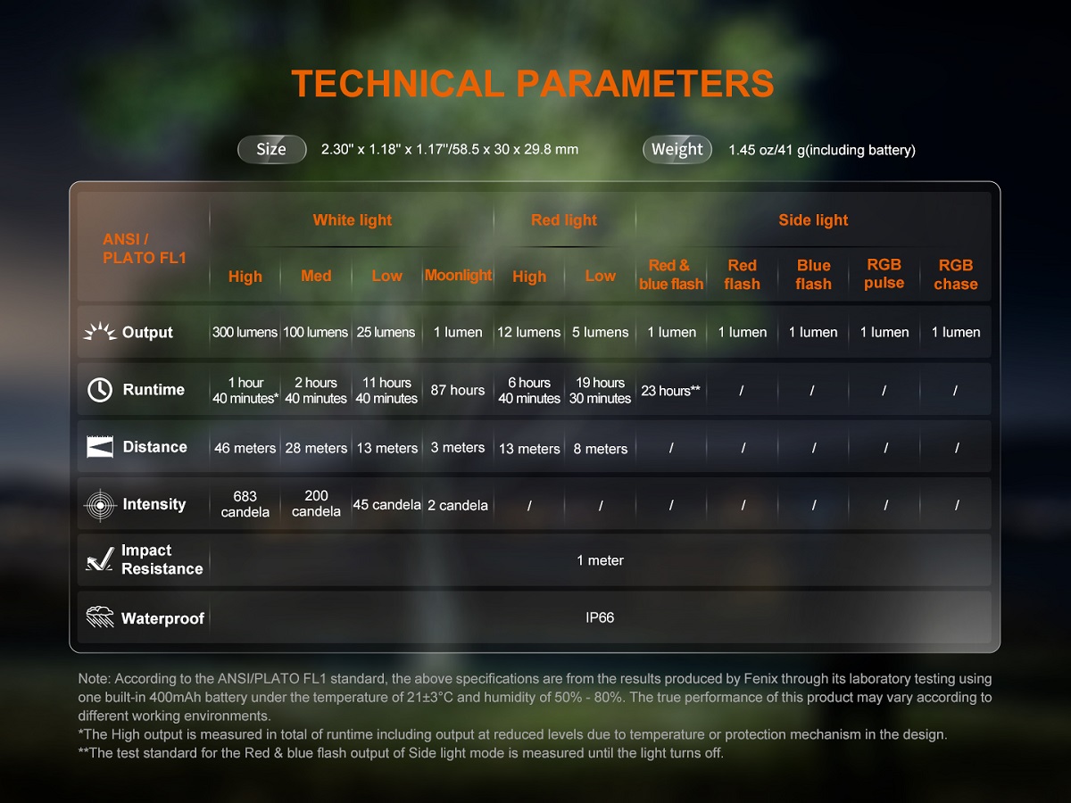 - Built-in 400mAh battery, with a runtime of up to 87 hours in the Moonlight output.