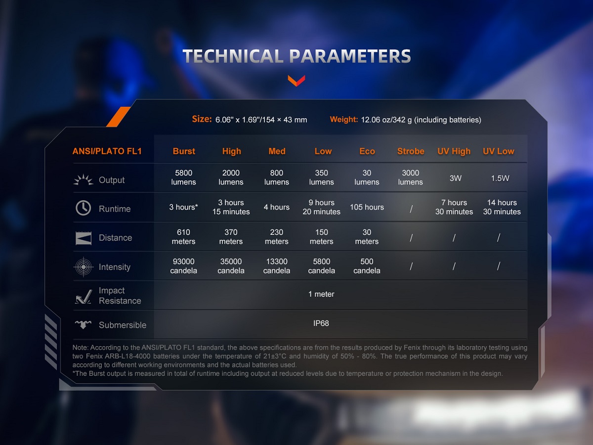 Unlock 5800 lumens of awe-inspiring clarity and 610 meters beam distance with the powerful and reliable Fenix TK35R high-performance multi-mode tactical flashlight. Additionally, this device is capable of delivering professional UV illumination with its built-in UV LED. The two included 4000mAh batteries provide an astonishing runtime of up to 105 hours in Eco mode. Built for ease and reliability, it features a Flexisensa control toggle switch for seamless mode switching, along with dual tail switches for instant strobe, instant burst, or other functions when needed. With IP68-rated protection and 1-meter impact resistance, this flashlight is perfect for law enforcement, tactical operations, SAR missions, or outdoor adventures.